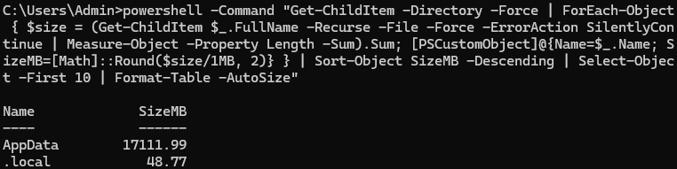 所以,反复清理,往往只能暂时缓解。 二、不装任何软件,先找出最占空间的文件夹只用 Windows 自带的工具,不需要安装任何程序。打开命令窗口(按 Win + R 键,输入 cmd 然后回车),默认在用户目录,这也正是我们要处理的目录。 复制下面这一整行命令,粘贴到命令窗口,回车执行(如果在 PowerShell 中执行,则只需要复制双引号中的部分):