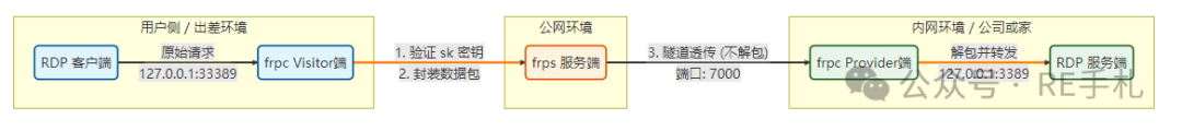 1. 本地请求 :你在本机访问 127.0.0.1:33389 。 2. 加密封装 :本机的 frpc (Visitor) 拦截请求,验证密钥,将数据打包。 3. 隧道传输 :数据包通过公网 7000 端口传给服务器,frps 不感知具体业务协议(如 RDP/SSH),仅作为 frp 隧道的转发节点。 4. 内网解包 :内网 frpc 收到数据,解包后转发给真实的 RDP 服务。 2. 环境准备 1. 公网服务器 (VPS) :拥有公网 IP (例如 1.1.1.1 )。 3. 搭建步骤 第一步:配置公网服务器 (frps) 在 VPS 上修改 frps.toml ,配置如下。