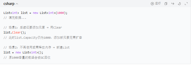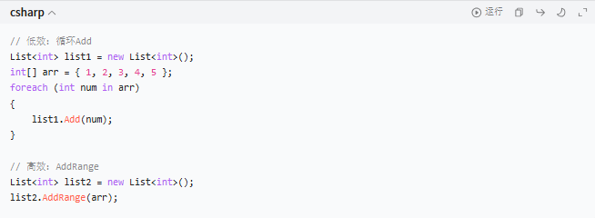 添加多个元素时,AddRange只需一次边界检查,而循环Add会多次检查,效率更低。4. 清空元素:根据场景选 Clear 或新建 List