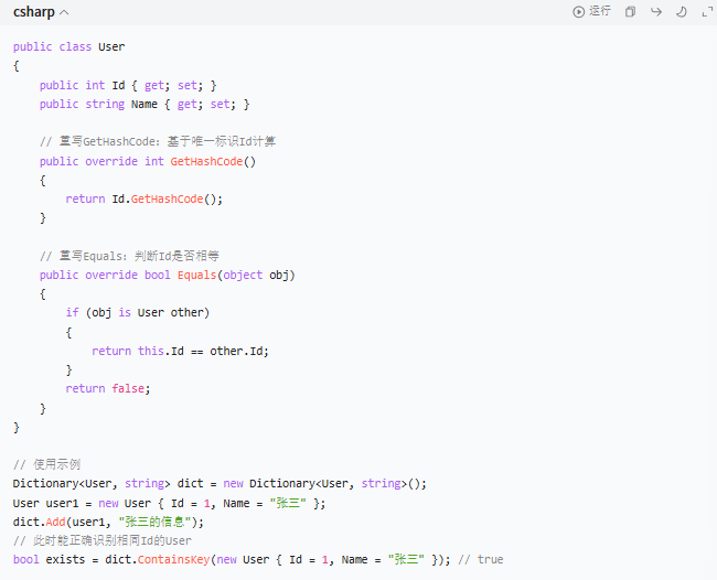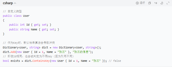 如果用自定义类型作为Dictionary的 Key,必须重写GetHashCode和Equals方法,否则会导致严重的哈希冲突,大幅降低性能。