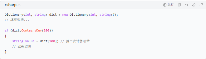 3. 查找元素:优先用 TryGetValue 而非 ContainsKey + 索引