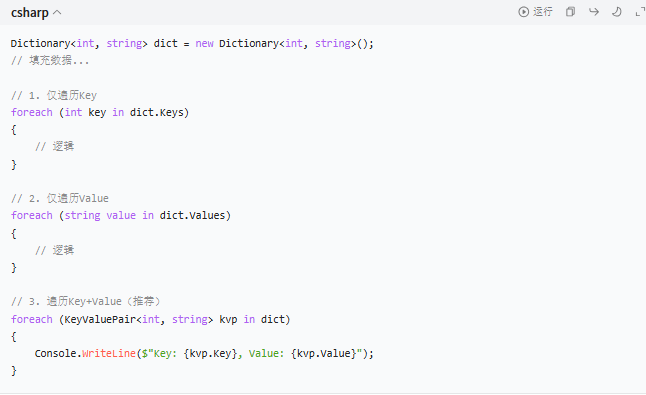 •需 Key+Value:遍历KeyValuePair(避免拆箱)。