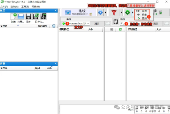 3. 选择同步模式点击中间的齿轮图标可以设置同步规则,FreeFileSync提供三种同步模式: ① 双向同步(Two way)