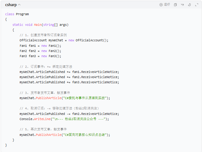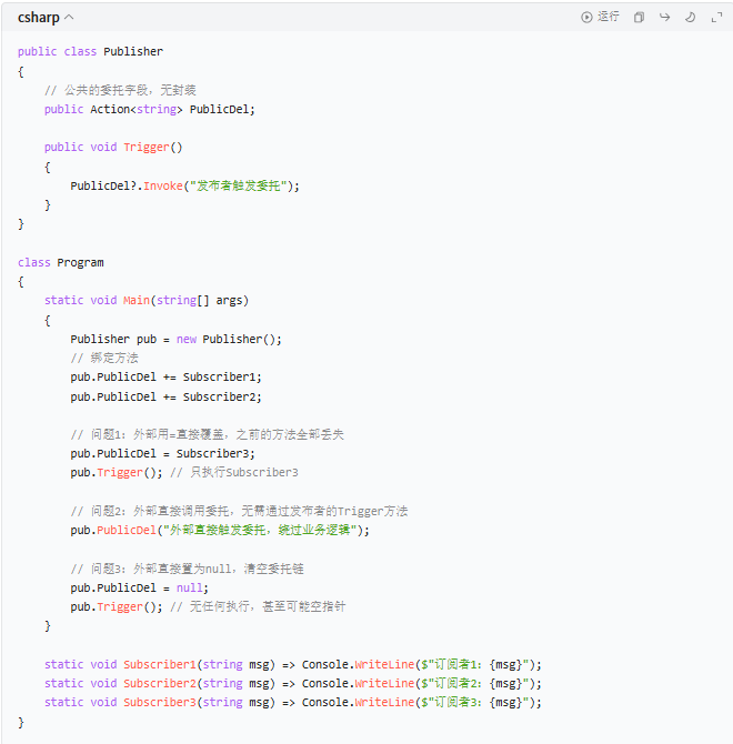 2.外部无法直接调用事件:只能由发布者自己在内部触发(比如示例中的OnArticlePublished方法),保证触发逻辑的可控性;