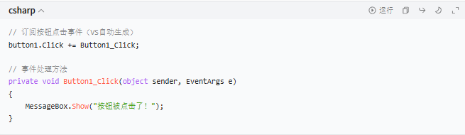 这是最直观的应用 ——WinForm/WPF 的按钮点击(Click)、文本框改变(TextChanged)、窗体加载(Load)等,都是事件,基于委托实现。这里的Click是按钮类的事件,基于EventHandler委托,sender是按钮实例(事件发送者),e是事件参数,和我们前面的公众号示例完全一致。3.2 异步编程中的回调