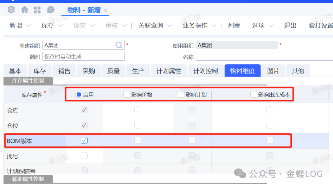 三、物料维度“启用BOM版本”的作用 在系统物料信息的 “物料维度”页签 中,里面有一个库存属性【BOM版本】;启用之后库存数据将会按【BOM版本】相同维度进行汇总数量。同时还能勾选是否“影响价格”、“影响计划”、“影响出库成本”等子选项,其核心区别在于库存管理粒度。