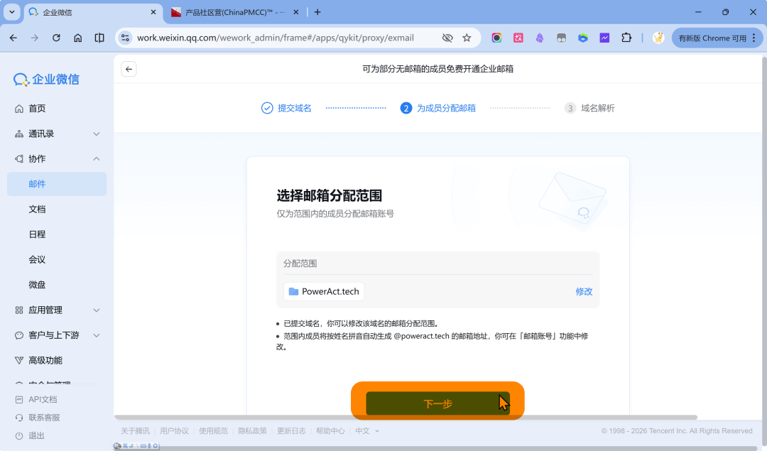 弹窗中选择邮箱服务商=腾讯企业邮箱