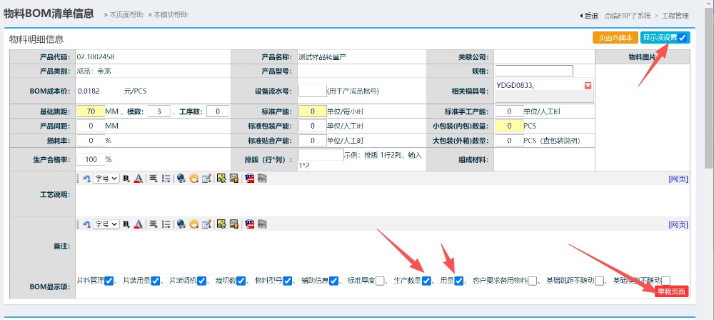进入界面后,勾上表头右上角的“显示项设置”,将生产/用量按钮勾上,点击重新加载。 加载后,对应非卷料栏位填上数值即可,例如纸箱用量,1600个成品用一个纸箱,填写内容如下