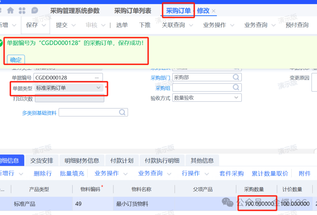 三、最小订货量的作用最小订货量,是指在发生采购需求时,最小的单次订货数量。即使实际需求量小于这个数值,采购时也必须按最小订货量下单。 设置与操作