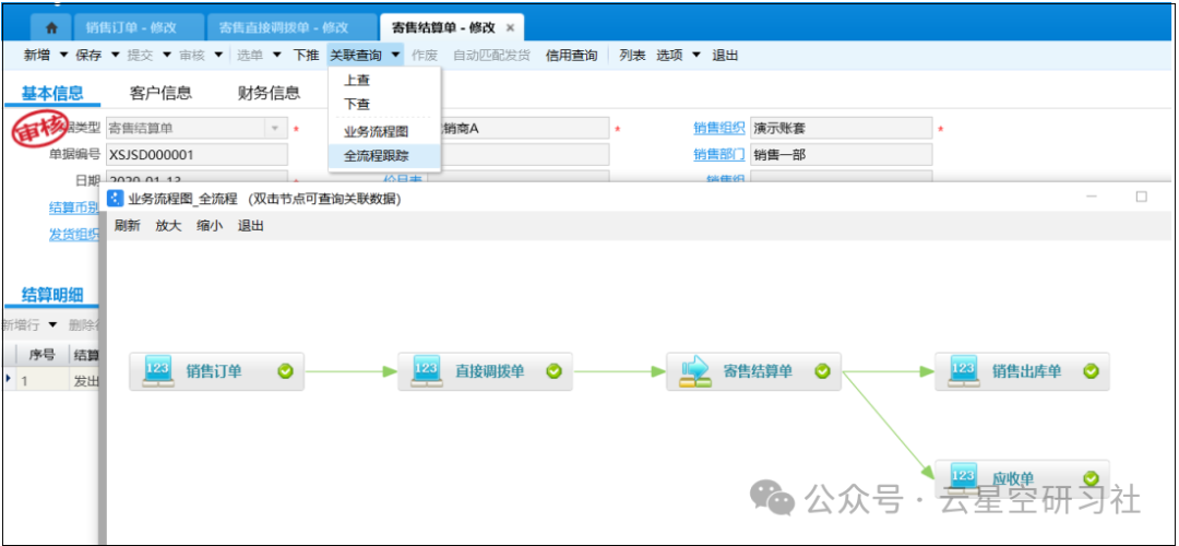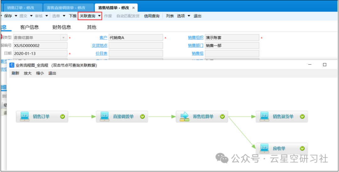这种退货称为 “结算退货”——货物已经结算确认收入了,退货处理更复杂。通过原本的【寄售直接调拨单】下推【寄售结算清单(退货)】,如图5-1:图5-1图5-2审核结算清单后,系统自动生成【销售退货单】和【应收单(红字)】!全流程跟踪如图5-3:5-3