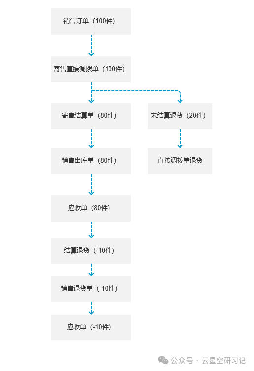 1月,企业委托代销商A销售物资100件。物资调拨过去后,代销商累计销售80件,剩余20件退回。结算后,客户又退回10件给代销商,代销商再次与我方结算。关键点:单据类型必须选择【寄售销售订单】,如图3-1:图3-1图3-2当代销商卖出80件后,通过【寄售直接调拨单】下推【寄售结算单】进行结算,如图3-3:图3-3寄售结算单审核后,系统自动生成销售出库单和应收单!如图3-4:图3-4这就实现了“一次结算,两单齐发”的自动化效果,大大减少了财务人员的手工操作,查看全流程跟踪,如图3-5:图3-5