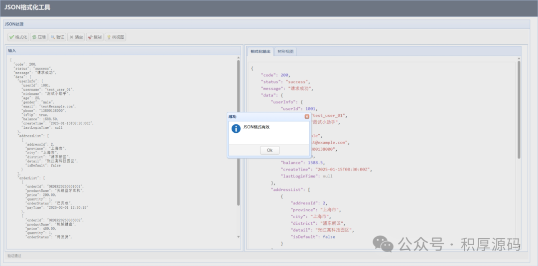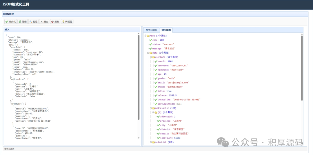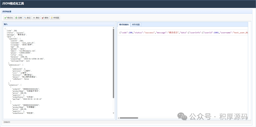 这个工具的核心诉求很简单:解决日常开发中的实际痛点。比如支持一键格式化,让杂乱的 JSON 瞬间变得层次清晰;也能反向压缩,满足接口传输时的精简需求;内置的 JSON 验证功能,能快速定位格式错误,不用再对着控制台报错逐行排查;还加了树形视图切换,复杂 JSON 的层级关系一目了然,比纯文本查看方便多了。