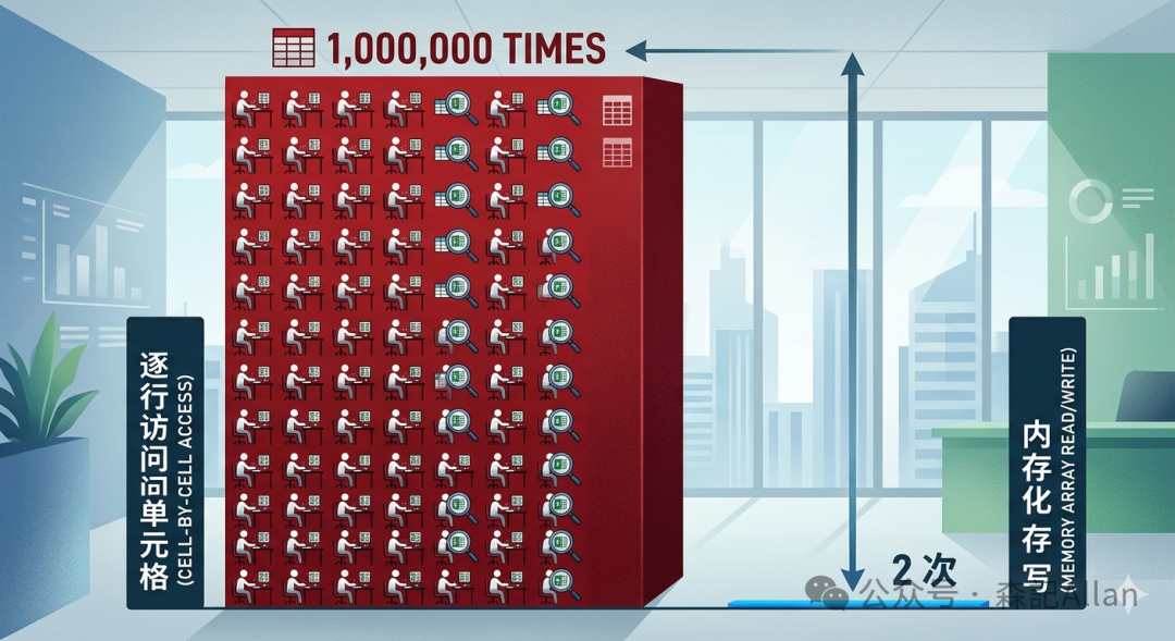 1. 频繁的 I/O 交互:每一次 Cells(i, j) 的读写,都涉及 VBA 引擎与 Excel 界面之间跨界通信。