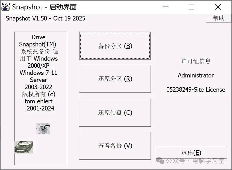 今天给分享一款小巧强大的系统备份还原软件--DriveSnapShot,v1.50.0.1748新版本(2025.10.19)。大小仅3MB,中文绿色便携版支持Windows2000/XP,Windows7-11,Server2003-2022。支持磁盘卷热备份还原,差异备份,增量备份,异机还原,远程备份,RAID磁盘...