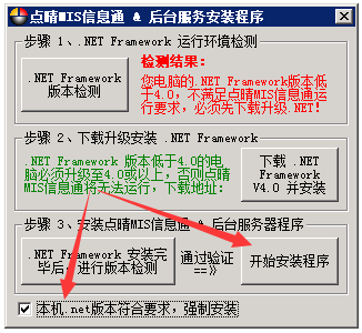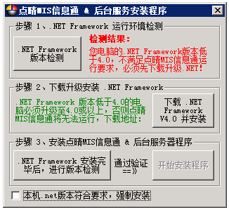 如果确定点晴OA服务器的确已经安装好.NET4.0以上的环境,那就可能是点晴MIS信息通的安装程序检测有误,按照以下教程操作即可。