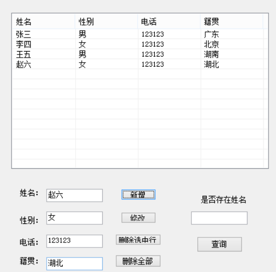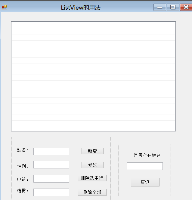 ListView是用于显示数据的,先在窗体中拉一个lisview控件,还有一些新增、修改、删除、查询按钮和文本框,控件名称为listview,按钮为btnInsert,btnUpate,btnDeleteOne,btnDelete,btnSelect,文本框的名称为txtName,txtSex,txtPhone,txtAddress,设计如下图所示: