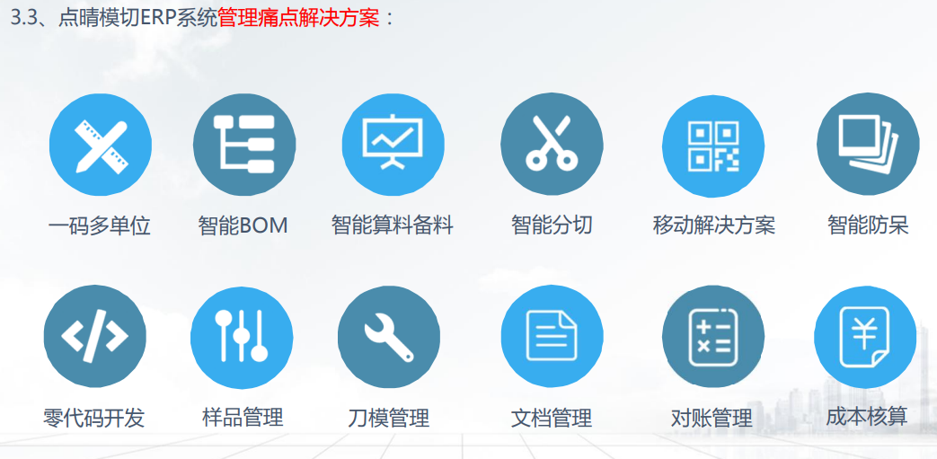 随着互联网和科技进步,智能时代已经到来,智能制造不仅被世界各国视为国家发展战略,也是模切企业面临内外压力与竞争,寻求转型升级的重要选择。近年来,点晴模切ERP系统助力模切企业实现智能制造的发展战略,以促进模切企业数字化为目标,打破模切企业管理中所遇到的痛点。经过18年的不断研发和优化,点晴模切ERP系统已经成为模切企业不可或缺的管理好能手,专为模切企业提供了一整套的信息化解决方案,包括销售管理、采购管理、生产管理(MRP/排产/制程管控)、仓库管理(原辅料/成品/刀模)、工程管(BOM/工艺/样品)、品质管理、财务管理(对账/存货核算/总账)等,并支持手机/手持终端实时在线操作,很大程度为模切企业增效降本。点晴模切ERP结合移动扫码解决方案,从原材料入库到领料、成品入库到出库、用料用工汇报、IQC来料品检到FQC成品终检的全过程都通过扫码完成,大幅度提升数据采集的全面性与准确度,采集的生产数据通过进一步利用,将更大提高生产管控的效率。采购收货:通过扫码进行采购入库,零耗时,来料信息实时上传后台,库存即时生成。生产领料:绑定生产工单扫码发料,杜绝错发多发现象,扫码出库库存扣减零差错。生产管控:一键排产,生产进度即时汇报数据到系统,工单准时完工率达90%。生产入库:现场扫码完成质检录入工作,节省往返时间,仅需1分钟即可完成。销售发货:基于出入库扫码大大提高仓储效率,缩短单次出货时间,订单准时交付率可提升至100%。仓库盘点:现场按照储位对应物料扫码录入盘点结果,只需半小时实现库存整体盘点,错误率几乎为零。点晴模切ERP系统中的核心功能,直击模切企业的管理痛点:一码多单位:支持各计量单位之间的自动换算,解决传统ERP中无法满足BOM自动算料、分切优势、申购等多种需求。智能BOM:合理安排分切计划和生产计划,精确计算物料需求量,根据缺料情况自动形成申购单,解决了后续原材料管理失控。智能算料备料:实现了仓库物料自动锁定订单、自动形成分切计划、多订单合单共用料、呆滞物料优先使用,可有效帮助PMC排产/备料/申购,有效降低呆滞料的产生。智能分切:实现了分切料自动继承原始母料的基础属性,通过智能BOM的应用,实现生产备料时系统自动推荐物料或可用替代料,解决了只能用于管订单,管不了物料,造成大量无法识别属性的尾料堆积仓库或车间的窘迫。智能防呆:系统预设原材料保质期到期提前提醒,实时关注材料保质期状况,防止模切企业造成过量采购、分切尾料过多、发错材料、材料过期等情况发生。