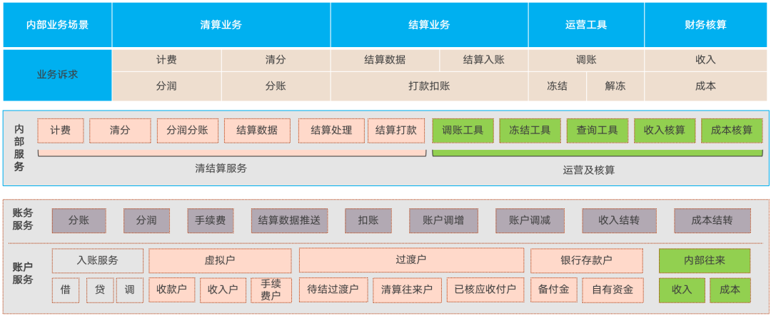 然后是基于内部客户的账务诉求看账务服务,主要就是清结算业务、内部运营诉求和财务核算诉求,内部业务依赖的账务和账户类型与客户支付和资金处理诉求存在差异;了解内部业务及诉求,可以为内部业务运转提供高效的“账务和账户服务”