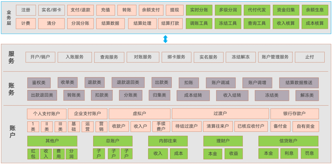 在业务层就可以产出如钱包、收银台、对公结算平台等用户产品,提供给用户和商户、内部财务人员或运营人员使用的产品工具。