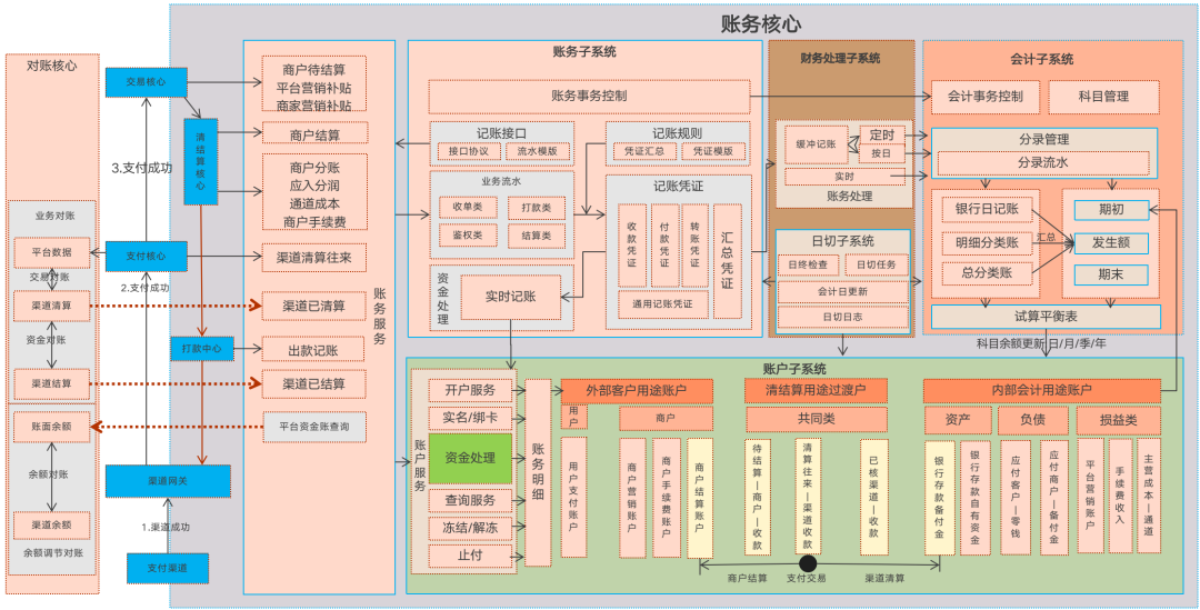 所有相关的外围系统,例如交易系统、支付系统、清结算系统等本书前面章节均做了详细的解析,将“各业务系统,业务系统产生的记账种类,账务核心”等内容整理到一张架构图中来阐明这种浑然一体的全局关系。