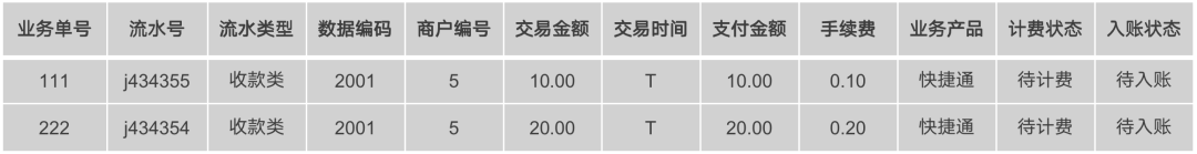 业务记账数据通过指定接口提交至账务系统以后,账务系统需要先生成业务流水进行存储。因为不能业务数据不落地直接生成记账凭证,需要原样保留原始凭证;更不能让业务用记账凭证的格式提交数据,那不是业务系统该做的事情。以收款记账为例(下同)来串联这个流程,下表是收款业务流水,信息做了简化,一共2笔订单,数据编码都是2001类型,另外还有商户编号、交易金额、时间、支付金额、手续费、业务产品等维度的信息。