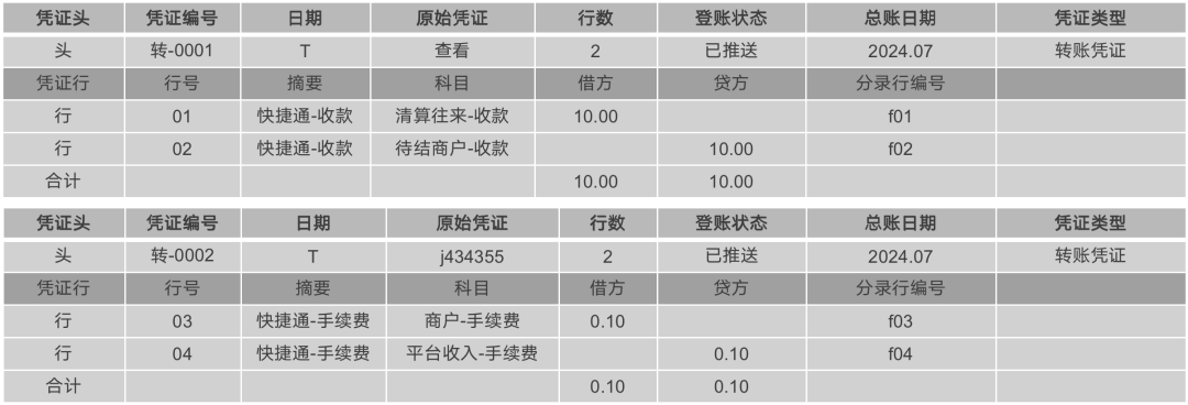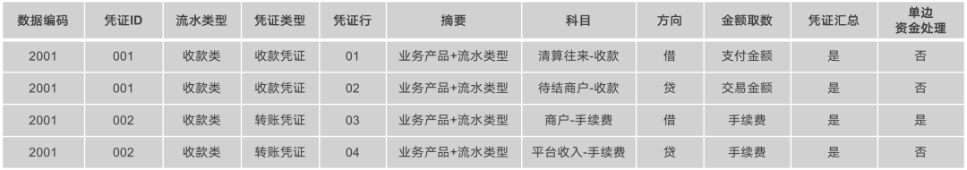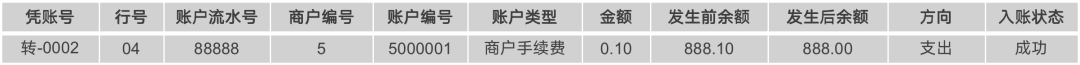 通过规则可以看出来,会生成2张凭证,并且其中002号凭证的03行需要进行单边的资金处理,实时更新商户手续费账户,生成的2张凭证如下表所示。