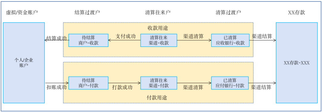 整个账户体系包含5套账户,分别是商户结算户、结商户账户、清算往来户、已核银行收付、银行存款,其中共同类账户又分成了收款类和付款类,这样的账户设置共同完成了基于支付交易的向内结算和向外清算的支付业务框架
