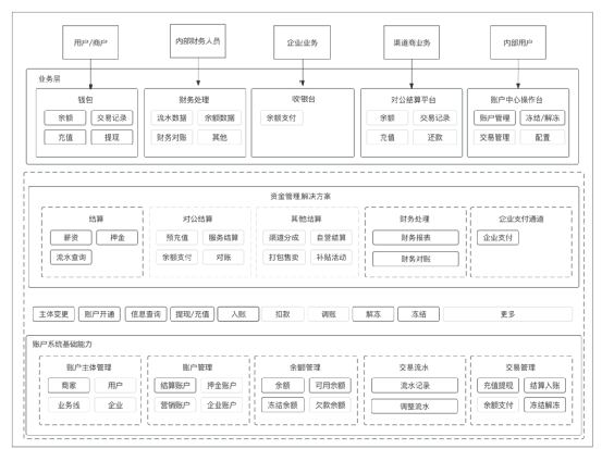 账户是一个底层服务,基于账户提供的服务可以构建很多资金解决方案提供给不同场景、不同人员或者上层产品使用,整个解决方案蓝图如下图。