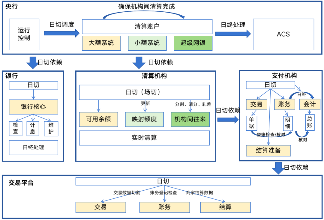 • 四个环节:支付交易环节、渠道清算环节、渠道结算环节、商户结算环节,四大环节构成了”“清结算”业务全链路,该链路上涉及到了全量的系统;