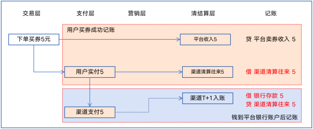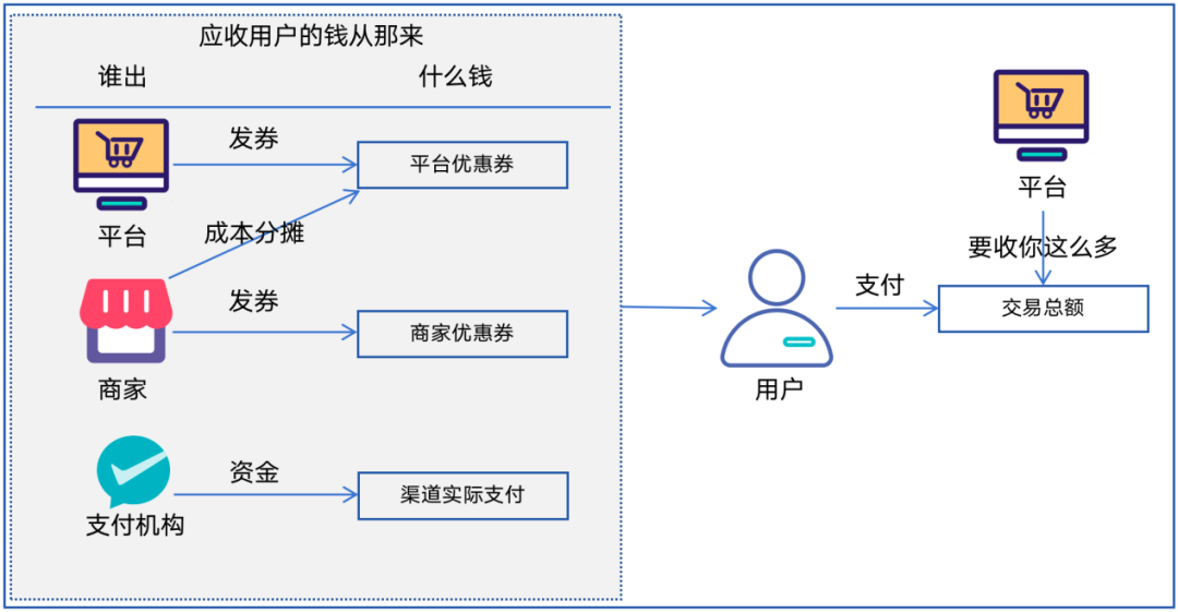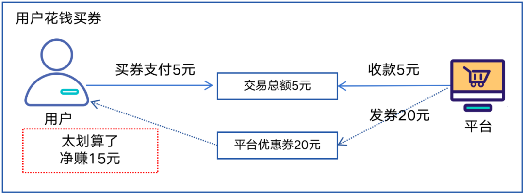 如果这张优惠券不是平台免费发放给用户的,而是用户自己花钱买的,例如用户花5元买了一张20元的平台优惠券,交易逻辑如图所示。
