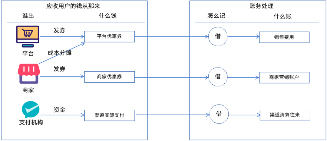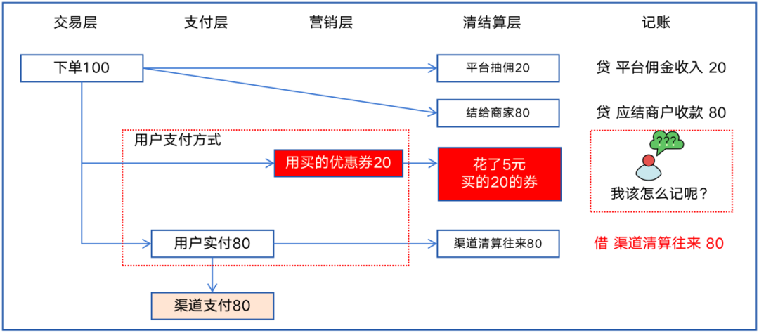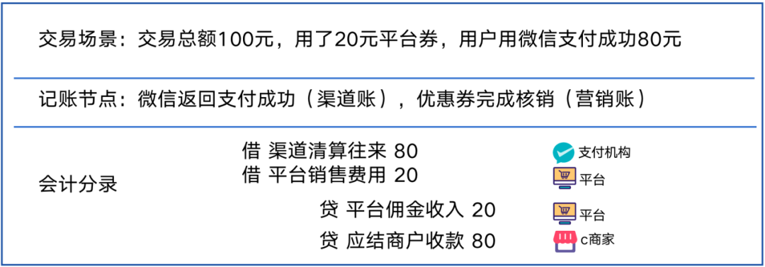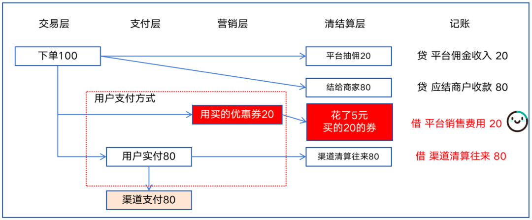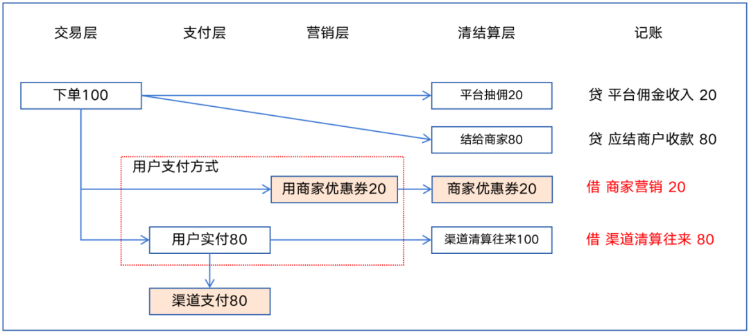 如果一笔订单100元,用户用了一张20元商家券,渠道实际支付80元,账务处理如下图所示。