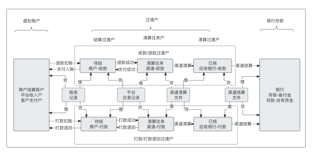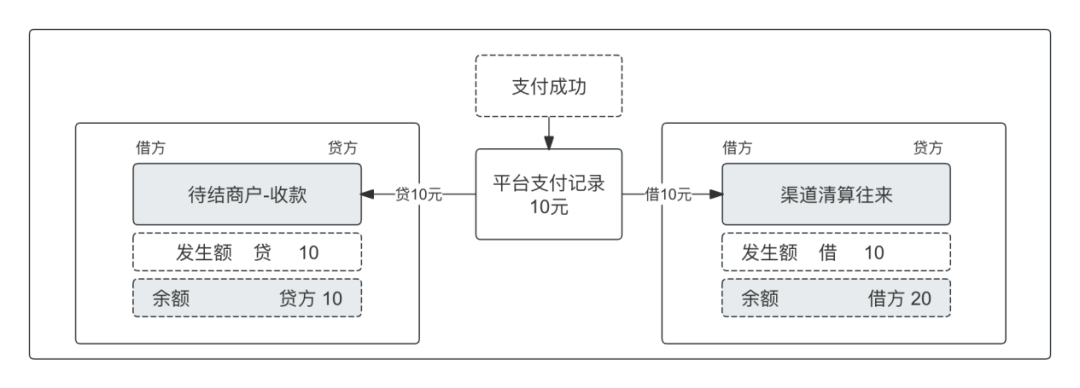 交易驱动账务进行记账,以支付数据为记账数据,借记渠道清算往来,贷记待结算商户