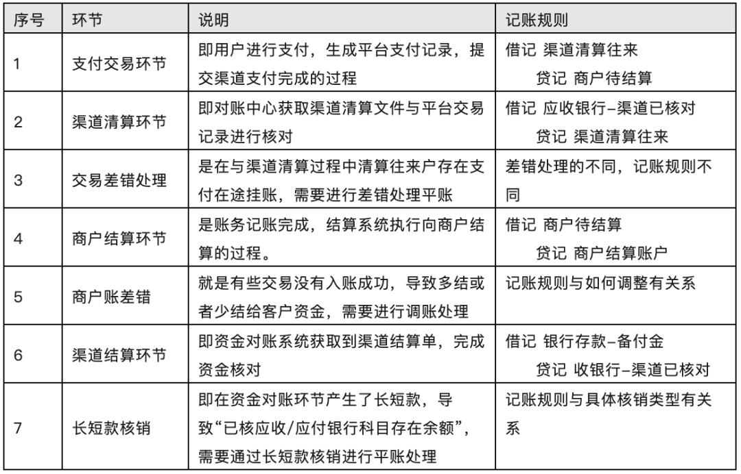 先看整个全局核算是如何做账务处理的,我们以收款业务为例,整个收款业务的账务处理涉及到4个环节、3类差错:支付交易环节、渠道清算核算环节、商户结算环节、渠道结算核算环节、客户差错、交易差错、资金差错环节,每个环节都有相应的记账源数据,以相应的记账规则操作相关账户,具体环节说明和记账规则如表所示。