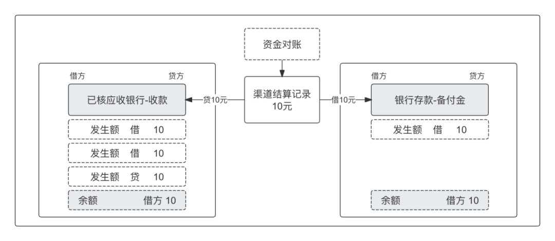 其中清算文件数据做为渠道清算记账数据,借记“已核对应收银行”,贷记“渠道清算往来”,记账情况如下