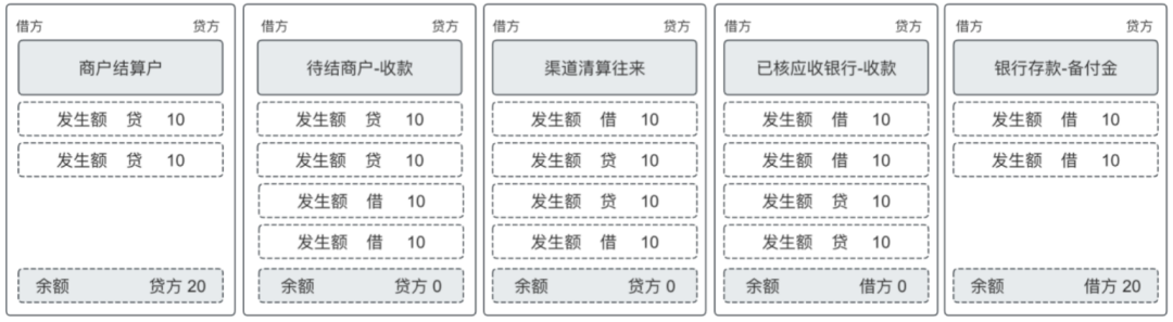 案例:平台收了2笔钱,都是10元,渠道T+1结算,给商户也是T+1结算,然后各环节数据情况及账务处理如下: