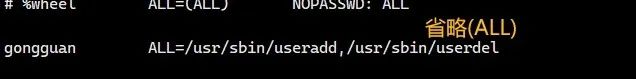 因此,图中第一行表示root用户可以在任何主机以任何人身份来执行所有的命令,第2行表示wheel组中的用户可以在任何主机以任何人身份来执行任何命令,第三行与第二行一样,只是无需输入密码1、下面定义用户gongguan可以执行的命令,如图: