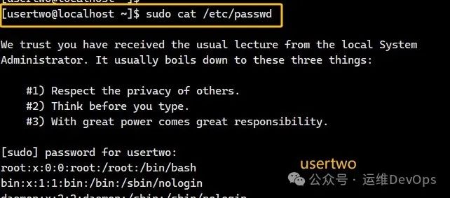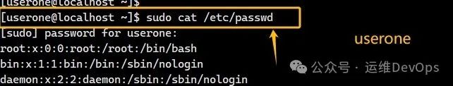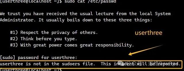 上述命令表示用户gongguan可以在任何主机以任何身份执行useradd和userdel命令,执行未授权的cat /etc/passwd命令就会报错,执行,并提示输入gongguan用户密码,如图: