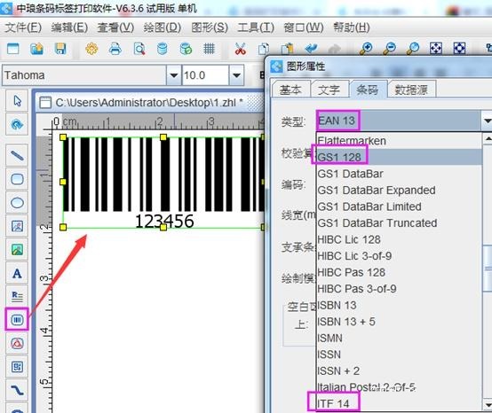 三种类型的外箱条码都可以在专业条码软件中制作,在条码软件中添加一个条形码,打开条形码属性,选择对应的条码类型(EAN-13、ITF-14或GS1-128)即可。详细的操作过程可以分别参考:条码软件如何制作ITF14条码、条码软件如何制作EAN-13条码、条码生成器如何生成GS1-128条码。