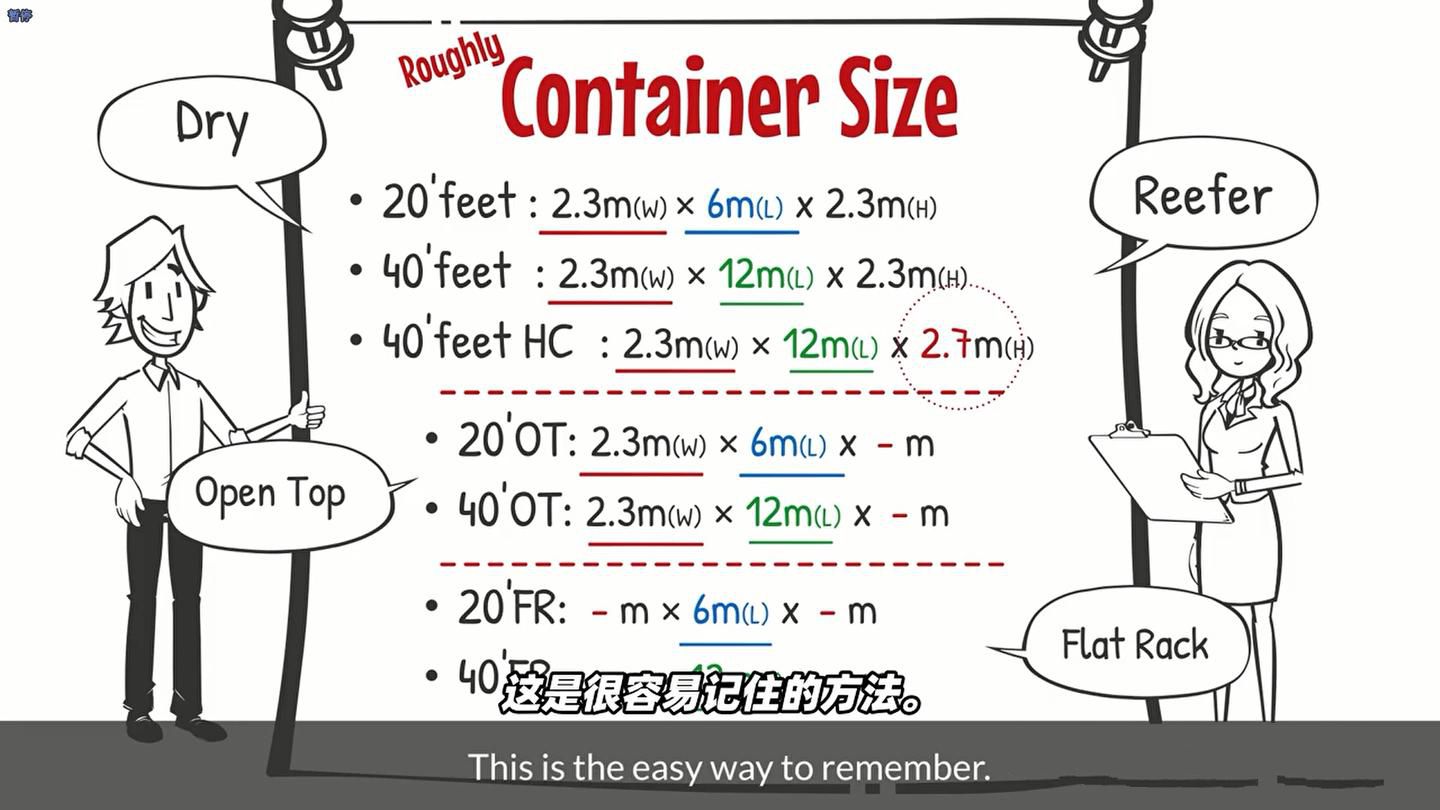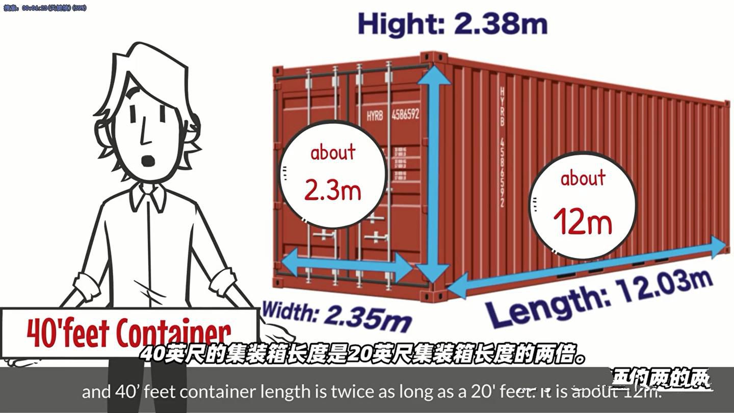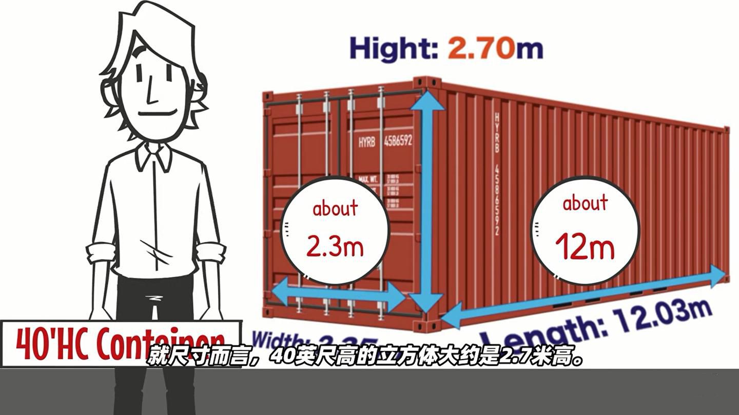 40英尺集装箱具有与20英尺集装箱相同的宽度和高度,即2.3米,但40英尺的集装箱长度是20英尺集装箱长度的两倍。大约12米。
