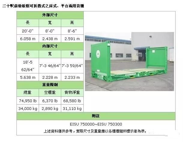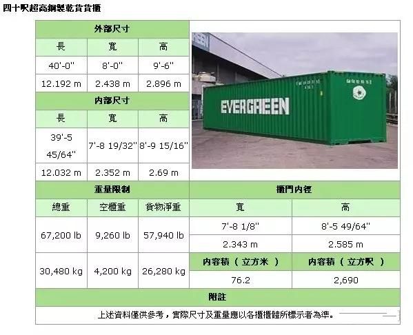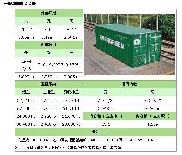 备注:集装箱适用于装载大型货物和重货,如钢铁、木材,机械,特别是像玻璃板等易碎的重