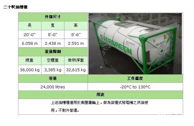 备注:这种集装箱是专为装运液体货物,如酒类、汽油、化学品而设计的