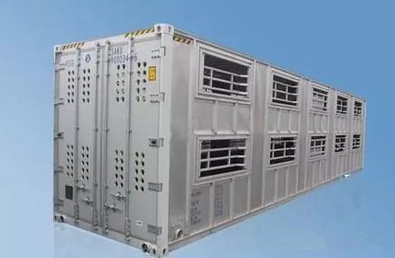 牲畜集装箱(pen container)这种箱子侧面采用金属网,通风条件良好,而且便于喂食。是专为装运牛、马等活动物而制造的特殊集装箱。