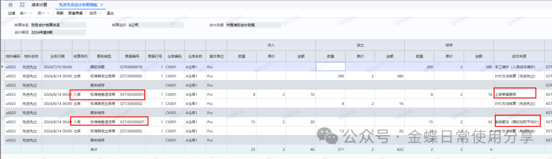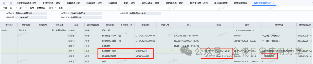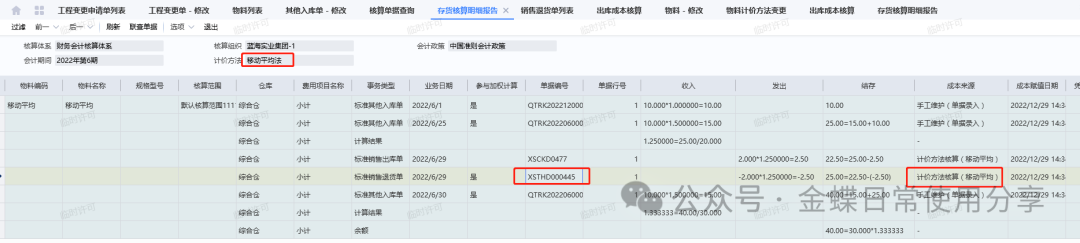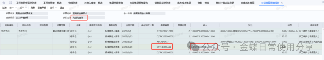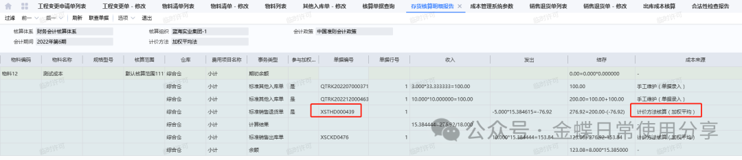 3. 销售退货单是由其他的单据进行下推生成或者直接新增无源单的销售退货单,则销售退货单会根据其计价方法计算出库成本: ① 计价方法是加权平均法或移动平均法,如下图中直接新增无源单的销售退货单(XSTHD000439)和销售退货单(XSTHD000445),取按照计价方法加权平均法或移动平均法计算出来的成本;