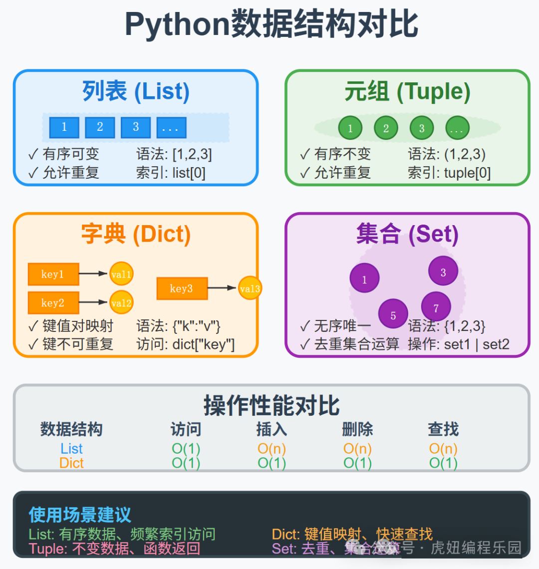 运算符:数学不好也能懂 ![]() Python中的运算符就像计算器上的按键,帮你做各种计算: 算术运算符:加减乘除这些 比较运算符:比较大小关系 逻辑运算符:并且、或者、非的关系 控制流程:让程序有“脑子” ![]() 程序不只能按顺序执行,还能根据条件做决定! 条件语句:如果...就... 这段代码的意思是:如果分数大于等于90,等级是A;否则如果大于等于80,等级是B;否则就是C。 注意哦,Python是用缩进来表示代码块的,一般是4个空格。这是Python的特色,也让代码看起来更整齐。 循环语句:重复的事情交给计算机 for循环:适合知道次数的循环 这会打印出0到4五个数字。 while循环:适合不知道次数但知道条件的循环 这段代码会一直执行,直到count不小于3为止。 函数:一劳永逸的智慧 ![]() 如果你有一段代码需要反复使用,那就把它写成函数吧! 函数可以有参数,也可以有默认值(比如上面的greeting="Hello")。这样你只需要写一次代码,就可以多次使用。 数据结构:数据的组织方式 ![]() Python提供了几种数据结构,就像不同的收纳工具: 列表(list):像购物清单,可以随时增删改 元组(tuple):像一次性打包的快递,不能更改内容 字典(dict):像真实的字典,通过关键词查找解释 集合(set):像数学中的集合,自动去重 异常处理:给程序上个保险 程序运行时难免会出错,好的程序应该能优雅地处理错误: 这样即使用户输入了错误的数据,程序也不会崩溃,而是给出友好的提示。 模块与包:站在巨人的肩膀上 Python最强大的地方在于有大量现成的模块可以直接使用: 除了Python自带的标准库,还有成千上万的第三方库可以通过pip安装,比如: