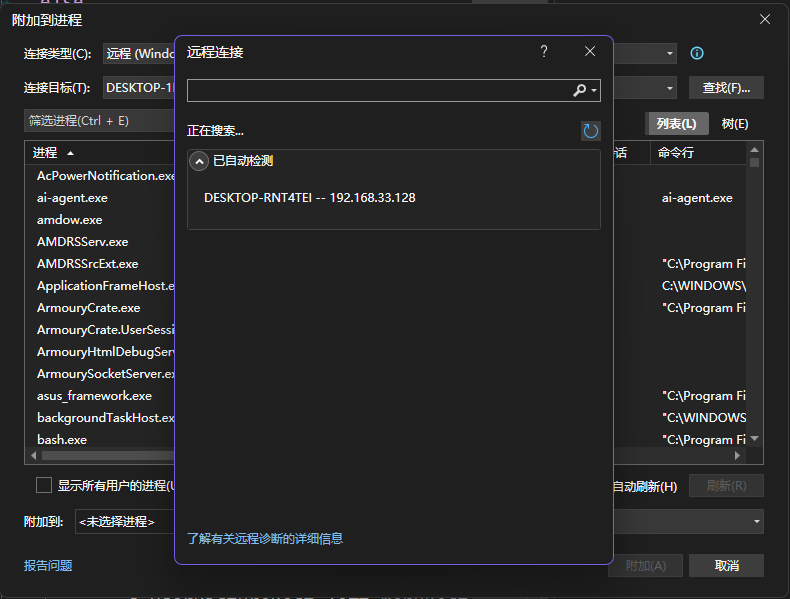 • 远程服务器名称:目标机器名称。msvsmon.exe 日志显示的名称,如 DESKTOP-RNT4TEI;这里也可以 IP+端口形式连接