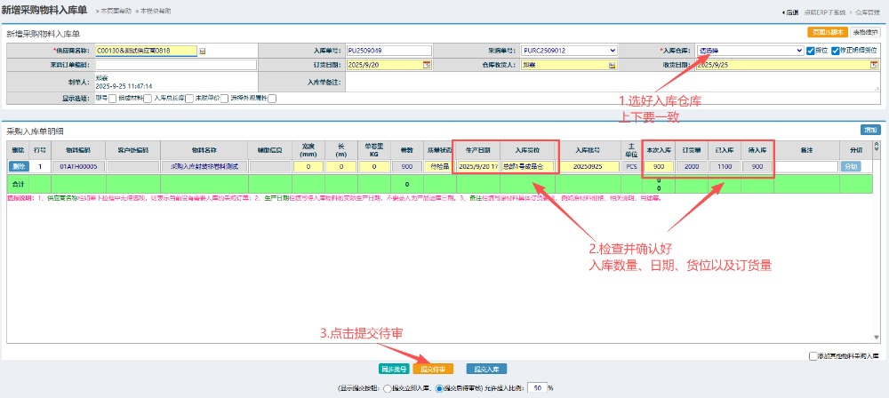进入入库界面,先选择好入库仓库,然后确认好物料的入库数量、订货量和日期,点击提交待审。 有多物料入库的话可以在右边点击增加。