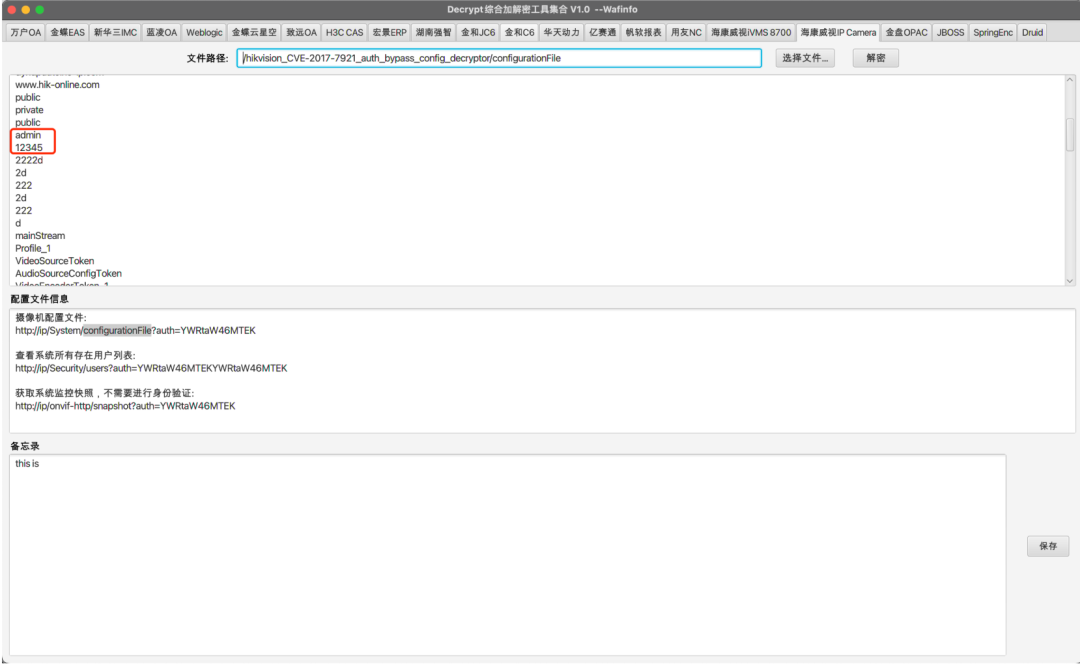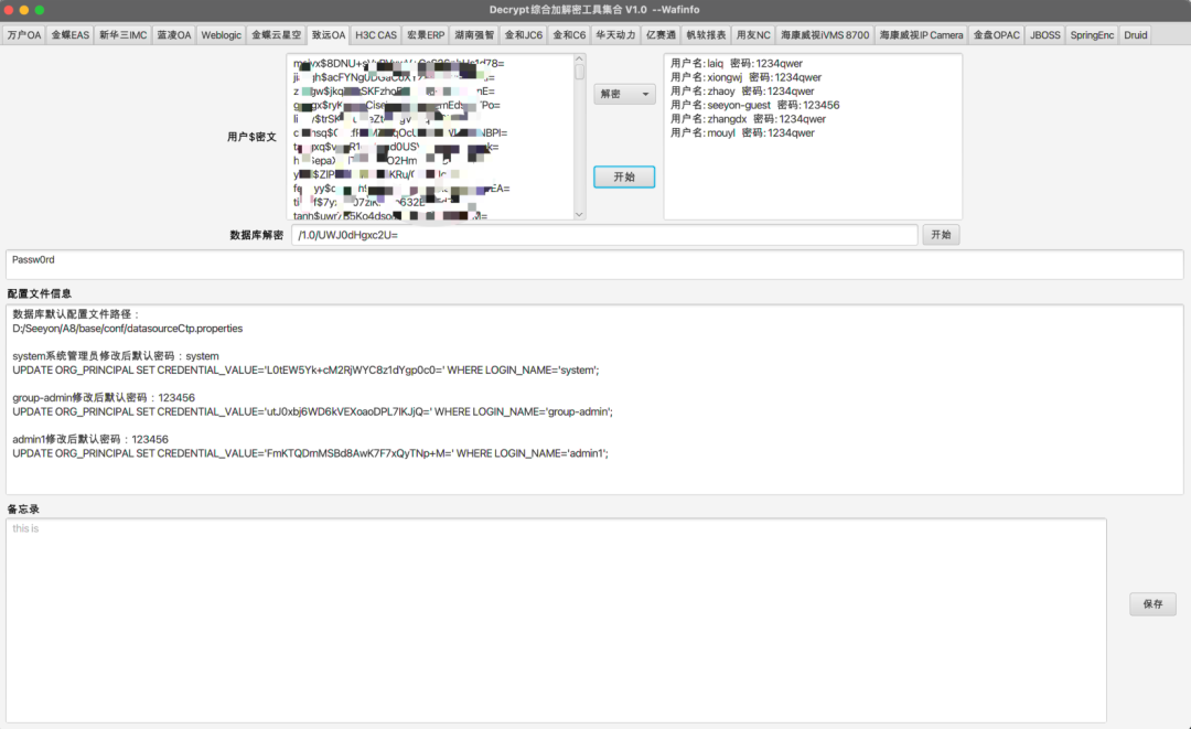DecryptTools是一款面向渗透测试和后渗透阶段设计的综合加解密工具,其核心功能在于快速解密各类系统加密数据(如数据库连接字符串、用户凭证等),同时支持AES、RSA、SM4等多种加密算法及逆向提取的专有加解密逻辑。该工具覆盖了20余种主流OA系统,包括万户OA、用友NC、金蝶云星空、致远OA、海康威视安防平台(iSecure/IVMS 8700/IP Camera)等。