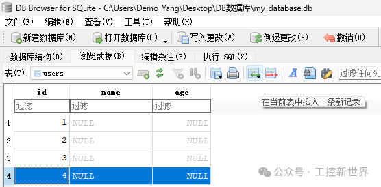 在数据表界面中,点击 "插入一条新记录" 按钮。我点击了4次。