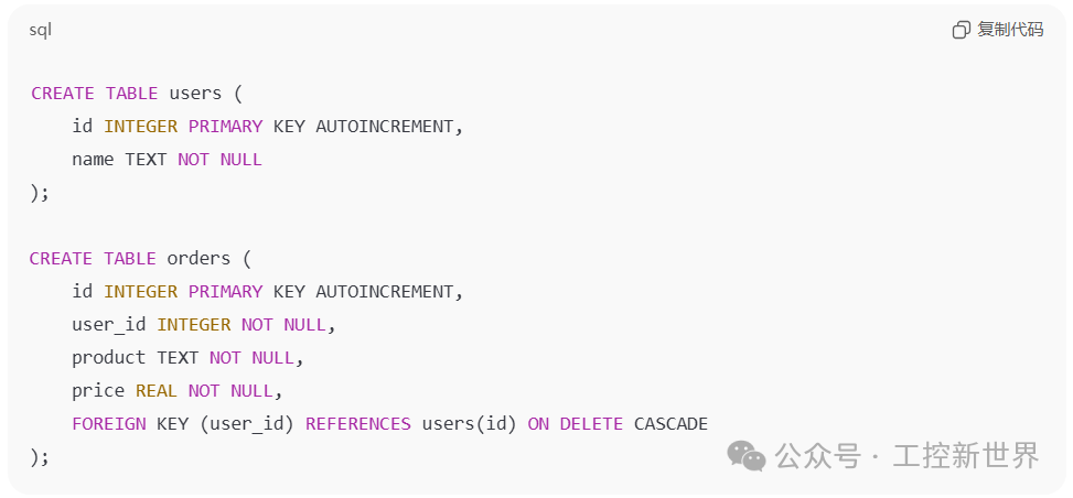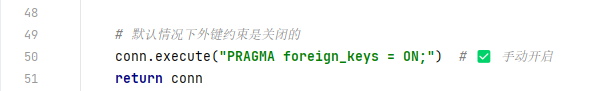 ⚠️ 注意:SQLite 默认 外键是关闭的,要显式打开: