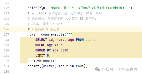 • 条件:只要 age >= 30 → 剩下 Bob(30)、Charlie(35)